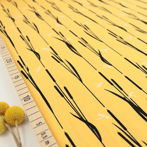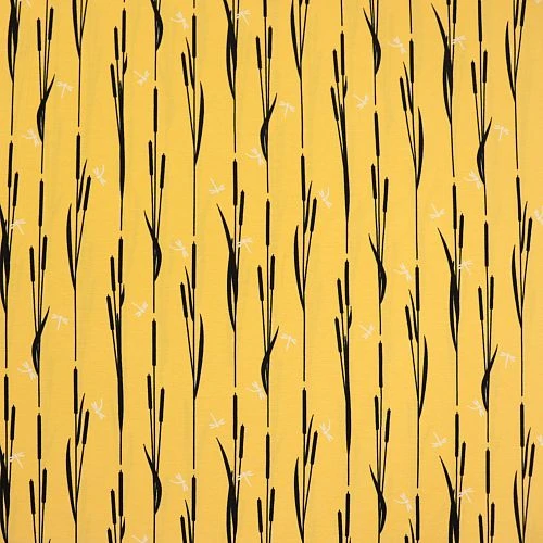 Unser Bio Jersey mit dem Motiv „By the Lake Sunny“ in senfgelb aus dem Hause Stoffonkel, ist der perfekte Stoff für Jungs und Mädels egal ob klein oder groß. Im Wind tanzendes Schilf erhält Besuch von kleinen Libellen. Wir sind verliebt.