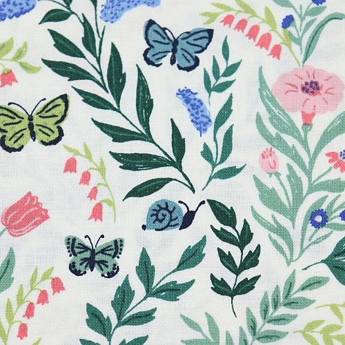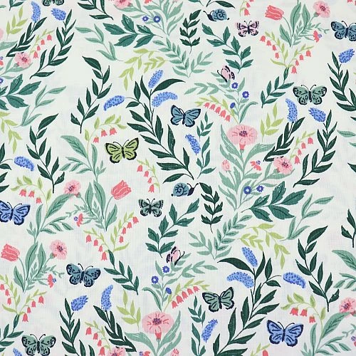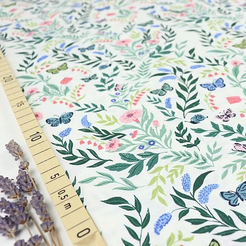 Das wunderschöne Design mit bunten Schmetterlingen zwischen Blumen auf weißem Hintergrund lässt jedes Herz höher schlagen. Auch für Wohnaccessoires wie Kissen und Bezüge ist der Stoff zu empfehlen.