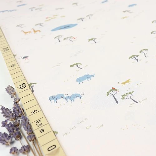 Das wunderschöne Savannen Design mit Elefanten, Giraffen, Nashörnern, Löwen, Geparden und Zebras lässt jedes Herz höher schlagen. Auch für Wohnaccessoires wie Kissen und Bezüge ist der Stoff mit afrikanischen Tieren zu empfehlen.