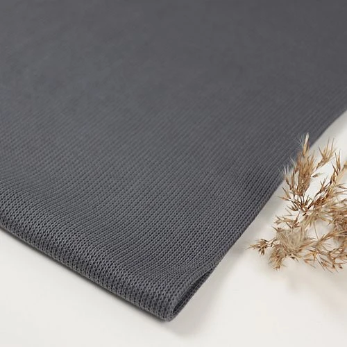 Der dunkelgraue uni Strickstoff hat eine Oberseite aus Strick mit Rippenmuster und eine glatte Unterseite für ein anschmiegsames Gefühl. Außerdem wird der Strick dadurch stabilisiert und kann so nicht ausleiern.