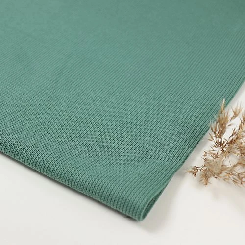 Der staubgrüne uni Strickstoff hat eine Oberseite aus Strick mit Rippenmuster und eine glatte Unterseite für ein anschmiegsames Gefühl. Außerdem wird der Strick dadurch stabilisiert und kann so nicht ausleiern.