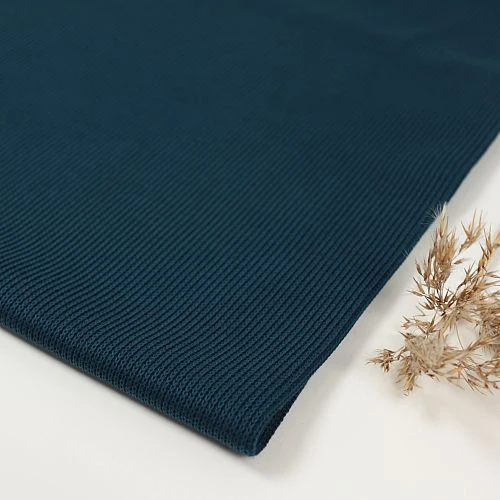 Der petrolblaue uni Strickstoff hat eine Oberseite aus Strick mit Rippenmuster und eine glatte Unterseite für ein anschmiegsames Gefühl. Außerdem wird der Strick dadurch stabilisiert und kann so nicht ausleiern.